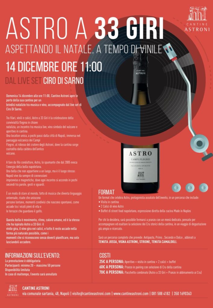 Tra filari, vinili e calici, Astro a 33 Giri è la celebrazione della convivialità flegrea in chiave natalizia, un incontro tra musica live, vino simbolo del vulcano e aperitivo in cantina.