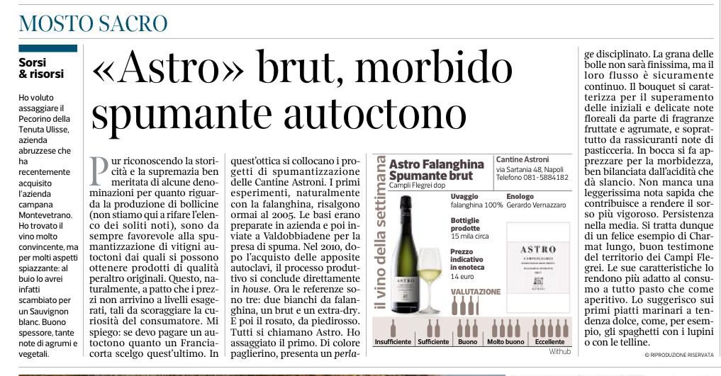 La rivista Mosto Sacro, nella rubrica Sorsi & risorsi, dedica un approfondimento allo Astro Falanghina Spumante Brut di Cantine Astroni, raccontando la storia e la filosofia produttiva di uno dei primi spumanti da vitigno autoctono dei Campi Flegrei.