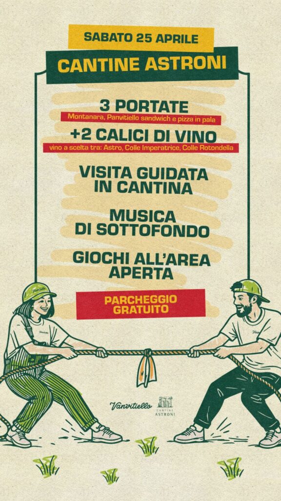 Con un contributo di 45€ a persona, l’esperienza comprende un percorso completo: tre portate firmate Vanvitello — dalla montanara con pomodoro stracotto e parmigiano in tre consistenze, al Panvitiello sandwich, fino alla pizza in pala con carciofi — accompagnate da due calici di vino a scelta tra le etichette di Cantine Astroni: Astro, Colle Imperatrice e Colle Rotondella.