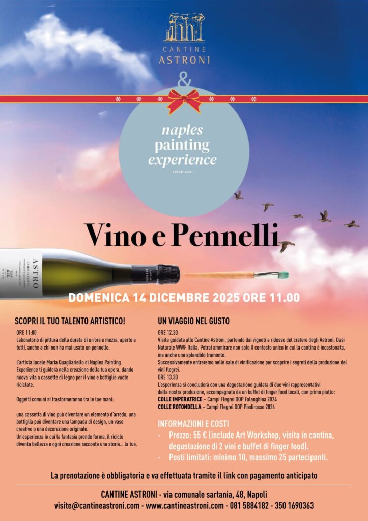 Tra pennelli, colori e buon vino, vivrai un’esperienza unica nella magica cornice delle Cantine Astroni, trasformando semplici cassette di legno e bottiglie riciclate in regali personalizzati e decorazioni natalizie originali.